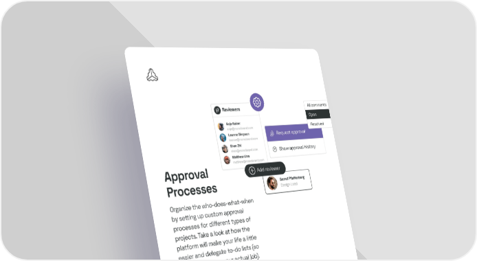 6 / 16 Creative Collaboration Approval Processes Organize the who-does-what-when by sett ing up custom approval processes for diff erent types of projects. Take a look at how the platform will make your life a litt le easier and delegate to-do lists (so you can focus on your actual job). Approval Processes Streamline every project by assigning coworkers ownership of assets or specifi c statuses, such as ‘Final Approval,’ or simply designate individual tasks. Integrated Notifi cations Stay in the loop with instant notifi cations about new comments, uploads, and other events via email or Slack.