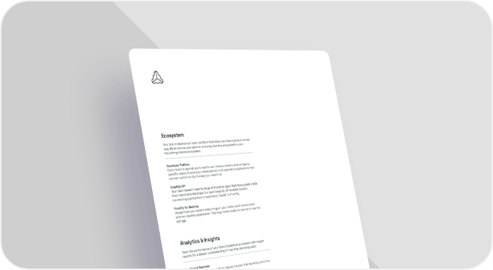 15 / 16 Creative Collaboration Ecosystem Your brand deserves an open platform that helps your brand grow in its own way. We’re here as your partner, ensuring harmony and growth in your flourishing internal ecosystem. Developer Platform Every brand is special; yours has its own desires, dreams, and company- specific needs. Enable your developers to build specialist applications that connect with Frontify the way you need it to. GraphQL API Your team doesn’t need to let go of the other apps that have a place inside their hearts and desktops. Our open GraphQL API enables custom, connecting applications to seamlessly ‘speak’ to Frontify. Frontify for Desktop Always have your assets ready-to-go in your native work environment with our desktop application. That way there’s really no excuse to use the old logo. Analytics & Insights Track the performance of your Brand Guidelines and assets with insight reports for a deeper understanding of how they are being used. Dashboard Overview Get an overview of your platform data and a user-friendly entry point into your brand's analytics. Guidelines Performance Track the power of your Brand Guidelines. Get insights into page views, unique visitors, active authors, users and more. Asset Performance Analyze the use of your brand assets. You'll see the amount of different assets being used and how often. Template Usage See how your templates are being used for all publications from Digital & Print Templates.