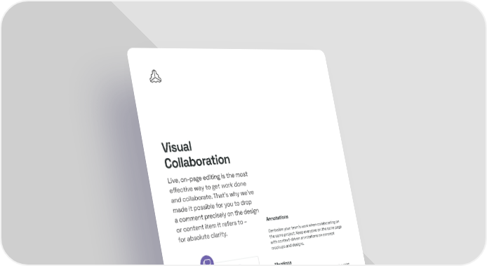 5 / 16 Creative Collaboration Visual Collaboration Live, on-page editing is the most eff ective way to get work done and collaborate. That's why we've made it possible for you to drop a comment precisely on the design or content item it refers to – for absolute clarity. Annotations Centralize your team's work when collaborating on the same project. Keep everyone on the same page with context-driven annotations on concept mockups and designs. Mentions Get quick feedback in the right place, from the right people. Assign individual actions or talking points to whomever it is relevant to with @mentions. mockups and designs. Mentions Get quick feedback in the right place, from the right people. Assign individual actions or talking points to whomever it is relevant to with @mentions.