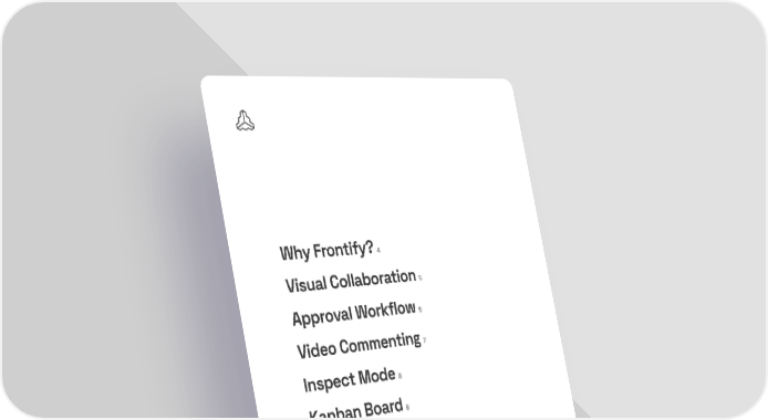 3 / 16 Creative Collaboration Why Frontify? 4 Visual Collaboration 5 Approval Workflow 6 Video Commenting 7 Inspect Mode 8 Kanban Board 9 Project Templates 10 Compare Revision 11 Interactive Prototyping 12 Platform Capabilities 13